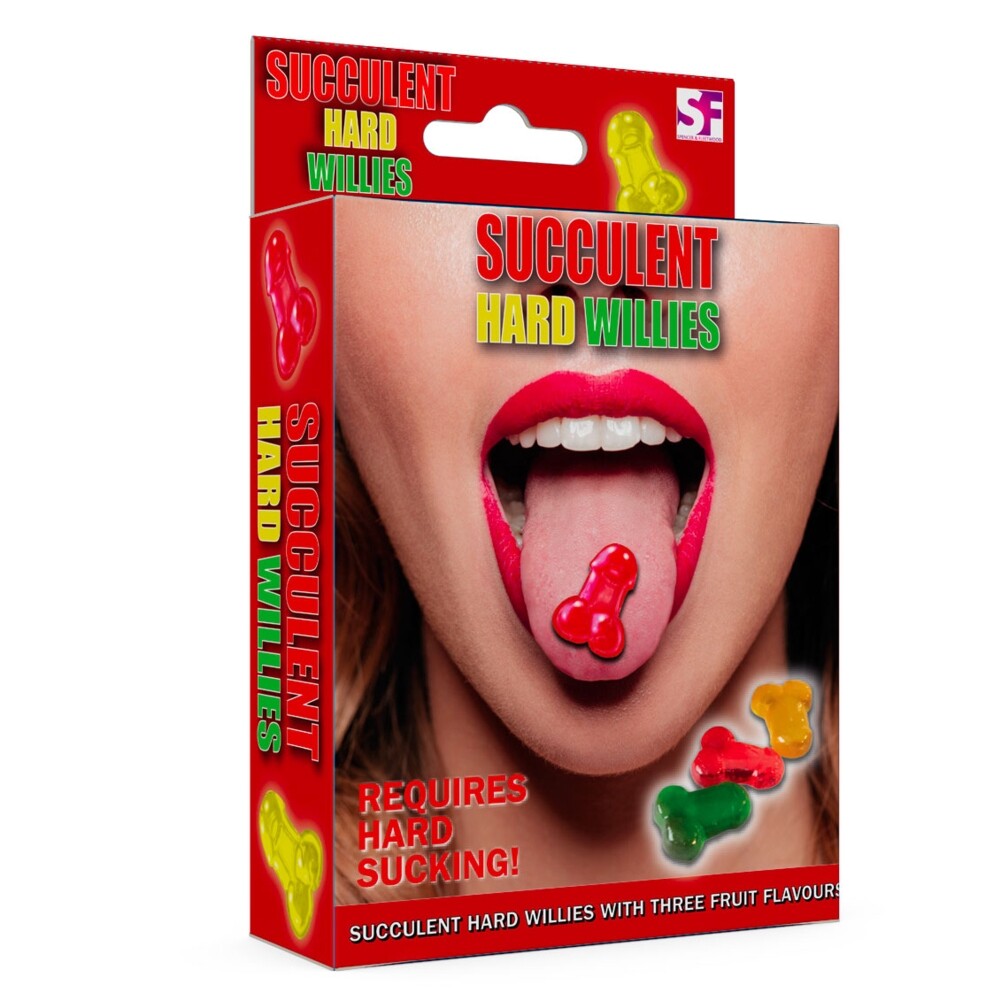 Ingredienti: The Succulent Hard Willies by <span class="hover:entity-accent entity-underline inline cursor-pointer align-baseline">Spencer & Fleetwood</span> are fruit-flavoured hard candies featuring a traditional long-lasting texture and a distinctive shape. Supplied in a 90g box, the product fits within the edible novelty category, making it suitable for assortments focused on impulse sales, gift items and party products; sold individually / 1 pc.